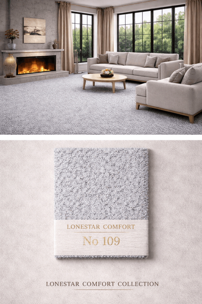 Perfect for bedrooms, living spaces, offices, and restful interiors, Lonestar Comfort No. 109 pairs beautifully with off-white upholstery, matte black accents, soft woods, and layered textiles. Its lighter tone keeps the room feeling open and fresh while delivering a warm, cushioned underfoot experience.