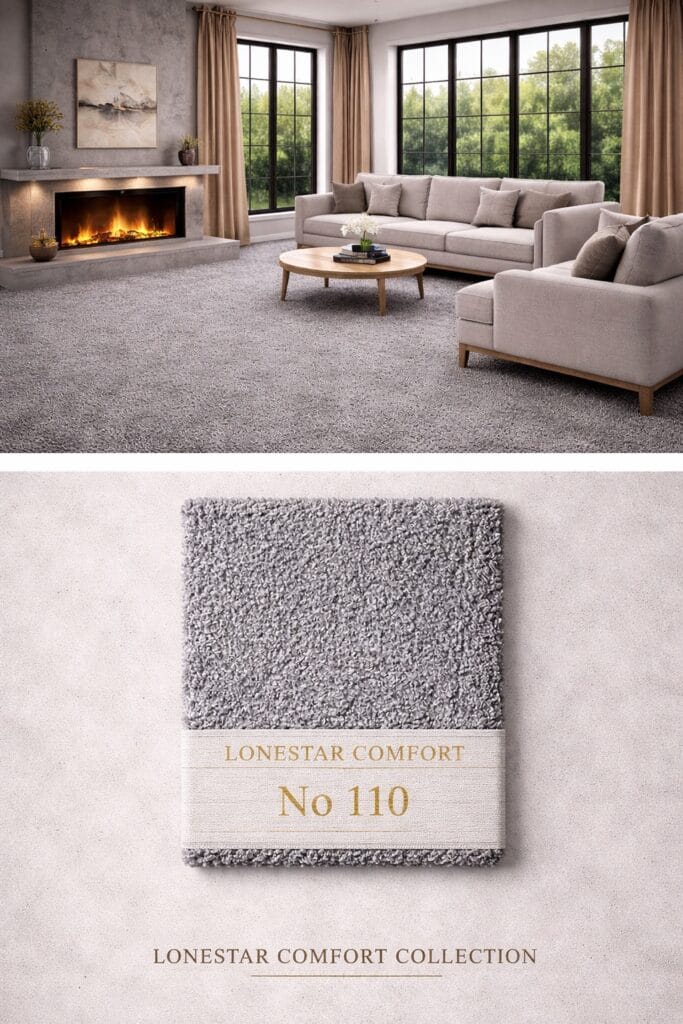Lonestar Comfort No. 110 offers a balanced gray carpet tone with soft visual depth and a plush finish that feels both current and comfortable. Its slightly deeper character gives the room a grounded, polished look while still maintaining the softness and warmth expected from a high-comfort carpet.