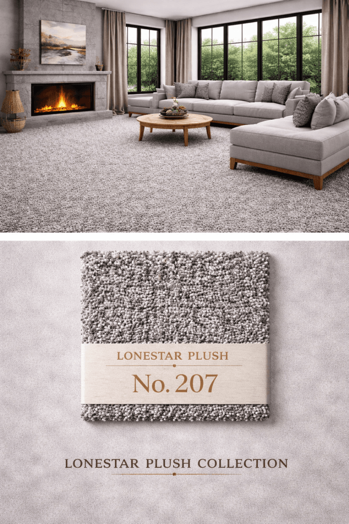 Built for contemporary homes and updated living spaces, Lonestar Plush #207 works especially well in living rooms, bedrooms, offices, and media rooms where a cooler neutral carpet helps define the room with a more modern edge. It offers a plush, comfortable look while supporting a sophisticated palette that pairs beautifully with black accents, natural woods, and layered gray tones.